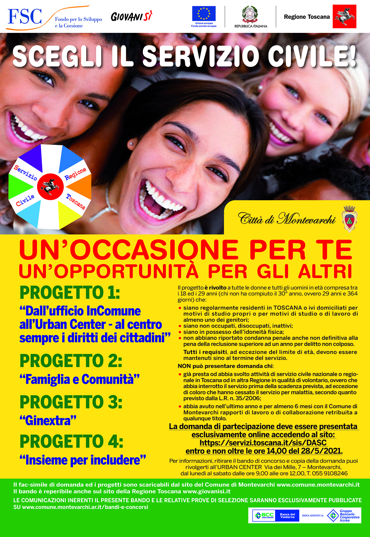 Per il il Comune di Montevarchi sono stati finanziati quattro i progetti, per un totale di 28 posti disponibili: i progetti sono scaricabili dalla colonna "Download" qui a fianco.