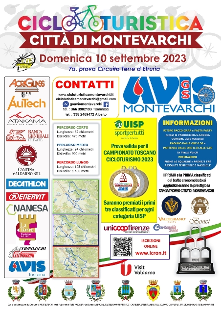 Tutto pronto per “La cicloturistica Avis- città di Montevarchi” che si terrà, domenica 10 settembre, con il ritrovo dei partecipanti alle ore 8.30, nella centralissima piazza Varchi.
