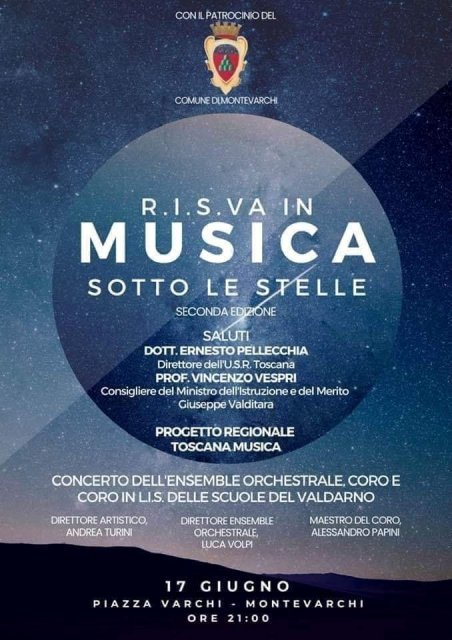 Piazza Varchi si prepara ad ospitare il concerto conclusivo di “Risva in musica sotto le stelle”. L’evento si terrà sabato 17 giugno, alle ore 21.00, e coinvolgerà oltre 200 ragazzi tra ensemble, coro e coro Lis, provenienti da ben 17 istituti scolastici di I e di II grado di tutto il Valdarno aretino e fiorentino.
