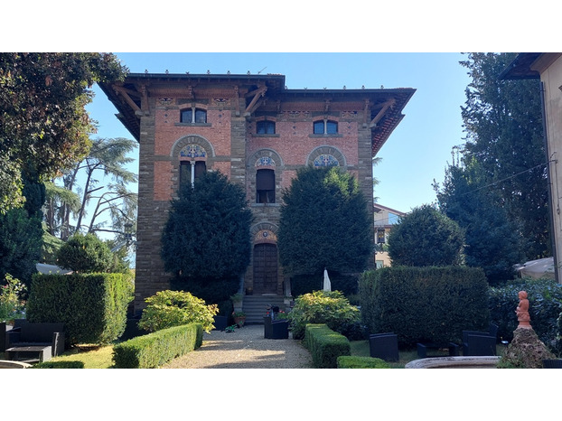 Il Palazzo è in stile neo-medievale con molti elementi Liberty e Déco. L’eclettismo caratterizza anche il giardino, ispirato a quello all’italiana nella zona antistante, mentre il resto è più simile al giardino romantico.