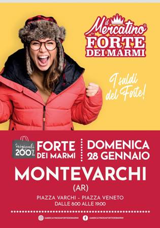 Domenica 28 gennaio dalle ore 8.00 alle ore 19.00 lungo le vie del centro storico (via Roma, p.zza Varchi e p.zza Vittorio Veneto) si svolgerà il Mercatino da Forte dei Marmi, un evento-mercato con i prodotti che lo caratterizzano quali abbigliamento, borse, scarpe, cashmere, biancheria, bigiotteria, pronto moda e tanto altro. Aperti anche molti dei negozi del centro storico. Una buona occasione, quindi, per passeggiare nel centro e approfittare dei saldi stagionali.