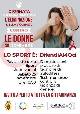 Il 25 novembre di ogni anno si celebra la Giornata Internazionale per l’eliminazione della violenza sulle donne istituita nel 1999 dall’Assemblea Generale delle Nazioni Unite. Per questa ricorrenza, la Commissione per le Pari Opportunità di Montevarchi, in collaborazione con l’Amministrazione comunale, il Centro Lyp e l’Associazione Eva con Eva ha organizzato l’evento dal titolo “Lo sport è: difendiAMOci” che si terrà presso l’impianto sportivo di viale Matteotti.
