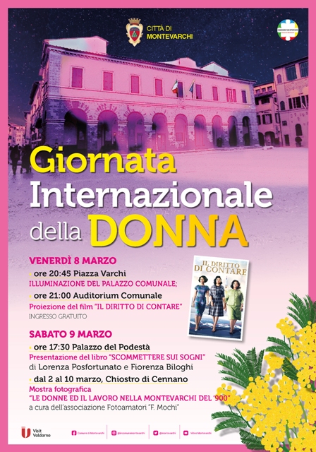 Tanti gli eventi promossi dal Comune di Montevarchi, in collaborazione con la Commissione pari opportunità, nelle giornate di venerdì 8 e sabato 9 marzo. Si va dall'illuminazione in rosa del palazzo comunale alla proiezione di film, presentazione di un libro, consegna di un riconoscimento a una donna che rappresenta un esempio, campagna social e mostra fotografica, tutte dedicate all'universo femminile