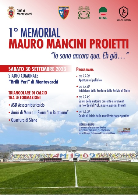Per questo motivo la manifestazione, a carattere sportivo, vedrà affrontarsi in un triangolare di calcio le formazioni composte essenzialmente da amici e ex colleghi: Asd Assocentauricalcio di Roma, Amici di Mauro- Siena "La Bilottiana" e la squadra della Questura di Siena. Ospite di eccezione per l'evento: la "Fanfara della Polizia di Stato" che si esibirà in alcuni brani musicali prima del fischio di inizio del torneo, seguiti dai saluti istituzionali del sindaco Silvia Chiassai Martini e delle autorità presenti, con interventi in ricordo proprio del prof. Mauro Mancini Proietti.