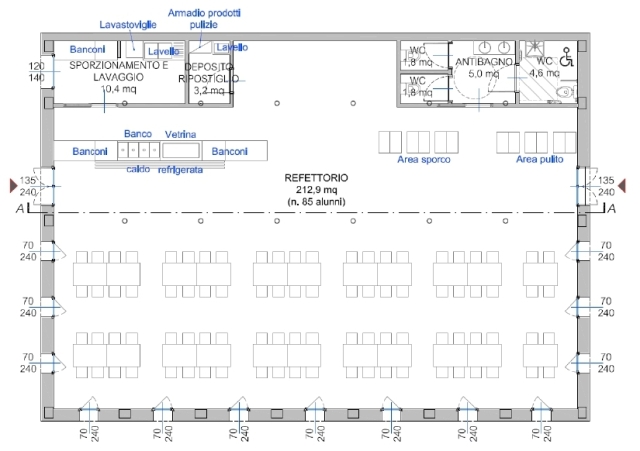 Il progetto prevede la realizzazione della mensa al servizio delle scuole dell’Istituto comprensivo Magiotti di cui il plesso del Giglio è ad oggi sprovvisto. Il nuovo refettorio, ubicato in adiacenza alla palestra, potrà accogliere al suo interno 85 utenti per turno di refezione e sarà composto da un locale di sporzionamento pasti, una zona lavaggio e servizi.