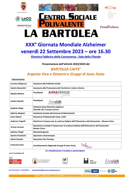 Venerdì 22 settembre ore 16.30 presso la biblioteca comunale “Ginestra Fabbrica della conoscenza”, a poche ore dalla ricorrenza della XXX ° Giornata mondiale Alzheimer del 21 settembre, saranno presentate in un incontro pubblico le attività 2023/2024 dei progetti “BartoleaCaffè”(dedicato alle persone malate di Alzheimer e loro familiari), “Argento vivo e dintorni” (per anziani autosufficienti) e dei “Gruppi di auto aiuto” che sono ospitati nei locali della Bartolea.