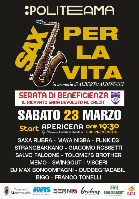 “Un sax per la vita” è il titolo della serata di beneficenza, nel ricordo del musicista Alberto Aldinucci, prematuramente scomparso, che unisce musica, volontariato e solidarietà. L’iniziativa si terrà sabato 23 marzo, al Politeama di Montevarchi, a partire dalle ore 19.30 con un'apericena e poi con l’esibizione sul palco di gruppi musicali, solisti e dj.