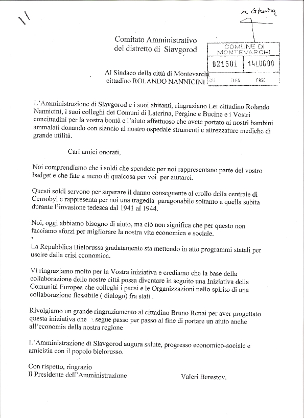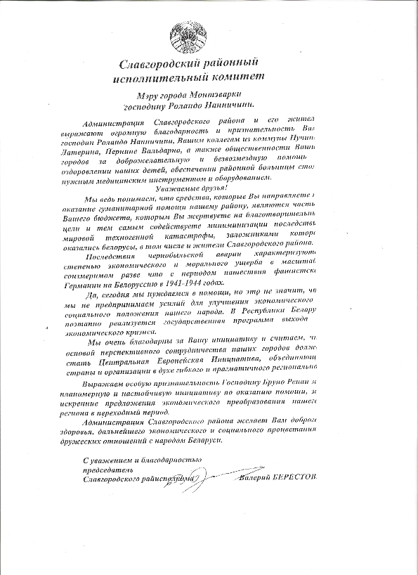 - Lettera di ringraziamento Presidente Slavgorod Valeri Berestov 1997 (originale) - (traduzione)